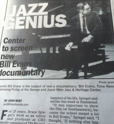 Bruce with Assistant  Bruce and his assistant take note of the Bill Evans Jazz Festival held in Hammond, Louisiana French Quarter  While in New Orleans, Bruce takes in the French Quarter Great Local Coverage  To the surprise of Bruce Spiegel, the local newspapers did a great job in covering the film Bruce with Joey  Bruce with his son Joey before the showing of the film in New Orleans