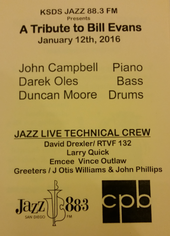 2John Campbell's Jazz Trio Local jazz musicians added to the event in San Diego, honoring Bill Evans. The set opened with Waltz for Debby.